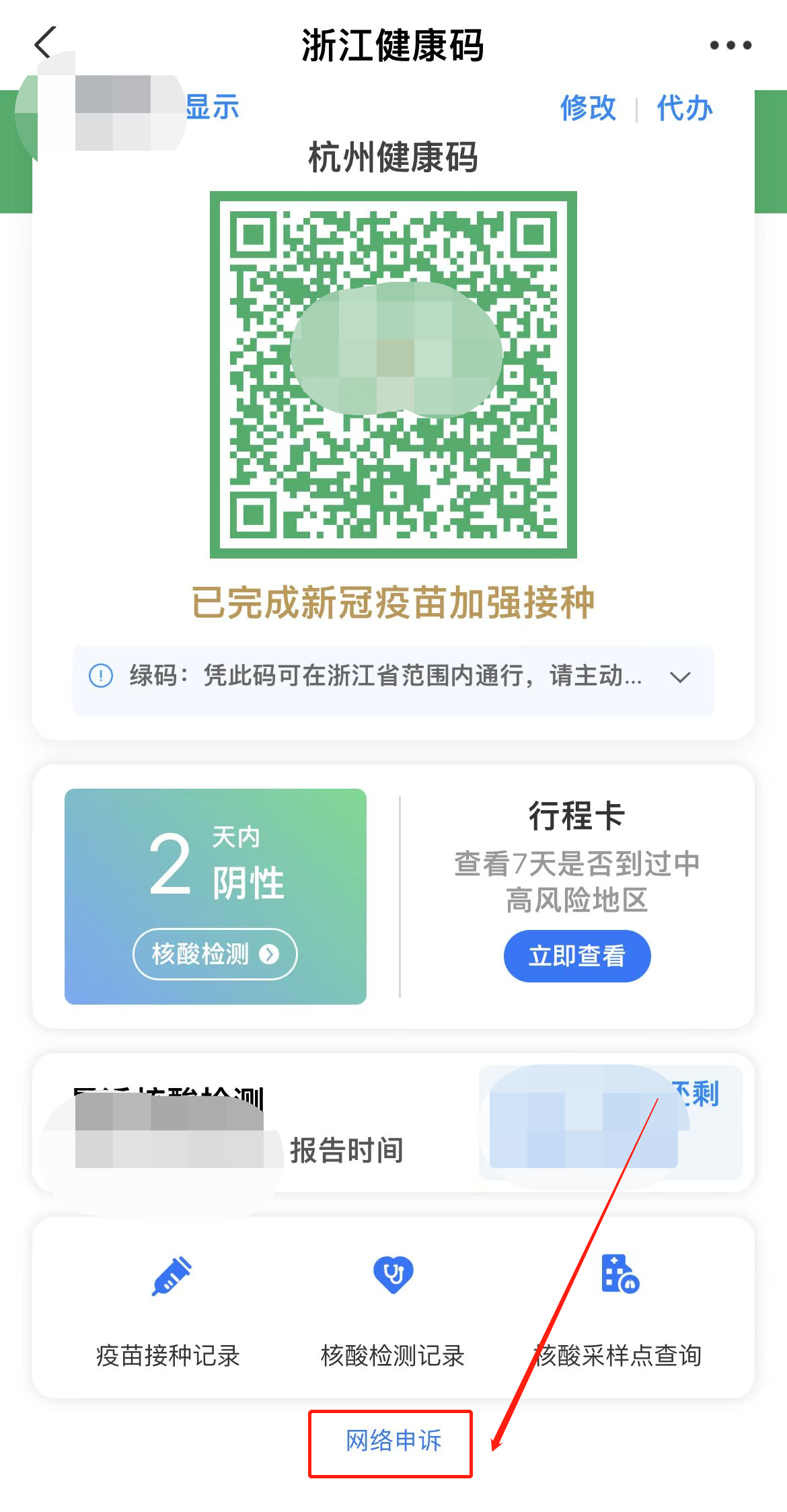 2、健康码变色了,也可以点击健康码旁边的“网络申述平台”进行申述,工作人员会尽快进行审核判断。