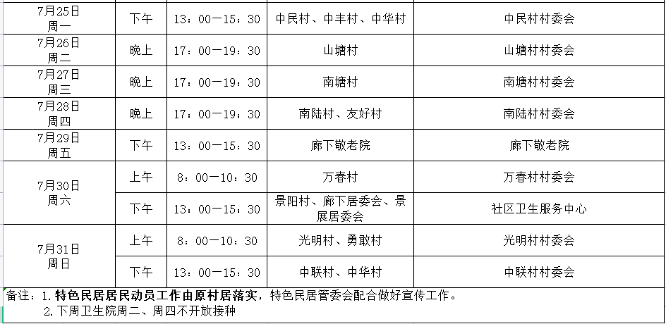 金山区廊下镇新冠疫苗接种安排(7.25-7.31)