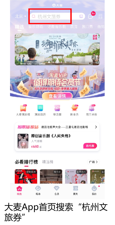 1、手机上打开登陆大麦App,搜索“杭州文旅券”点击即可直接进入杭州文旅券活动专题页,进行一键领券。