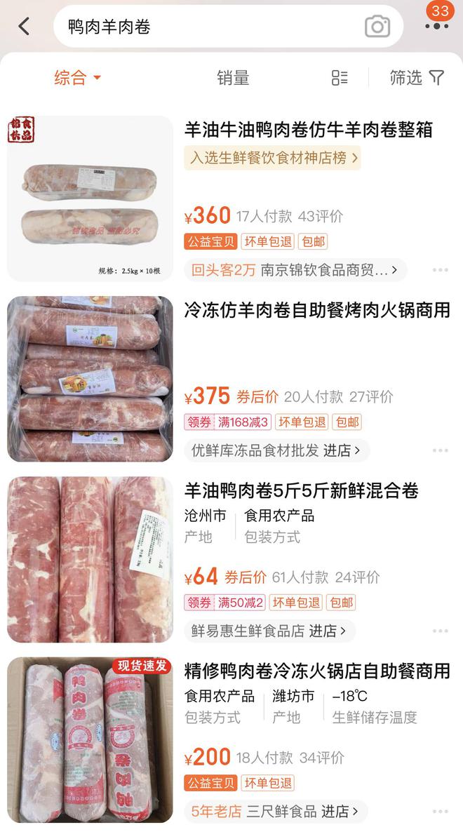 中新经纬在某电商平台上看到,也有一些商家向外批发“仿羊肉卷”,即羊油鸭肉卷。其中一家店铺,50斤“仿羊肉卷”的售价是360元,算下来约7.2元/斤。当被问及这类“仿羊肉卷”在外包装上标注的是鸭肉还是羊肉时,该店客服人员介绍,“标签上是鸭肉,加15%的羊油”。