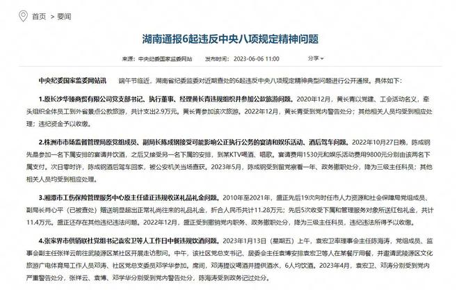 6月6日,中央纪委国家监委网站发布消息:湖南通报6起违反中央八项规定精神问题,其中,有一条对官员违规饮酒的通报,引起舆论关注。