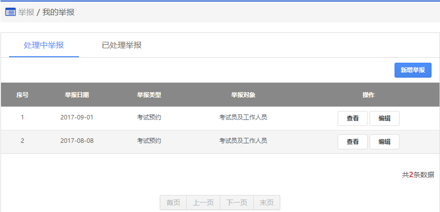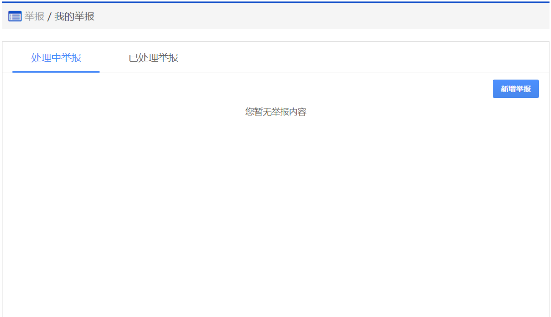 在该步骤,可以看到正在处理中的以及处理完成的举报列表。如果需要举报,请点击"新增举报",进入步骤3【添加举报】。