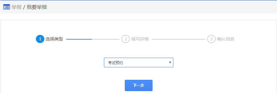 在该步骤,需要选择具体的举报类型,包括考试预约(车管所未按照全国统一的约考规则进行预约, 存在插队约考的情形;驾校未经学员同意强制代约考试,通过索要财物人为干预学员自主预约考试)、 管理服务(考试员、考场工作人员存在吃拿卡要、干预正常考试等损害考生权益的情形)、 考试作弊(考试过程中发现舞弊或者考试员、考场工作人员纵容协助作弊的情形)、 其他(预约考试过程中其他的违规情形),然后点击"下一步",进入步骤4【填写内容/上传证据】。