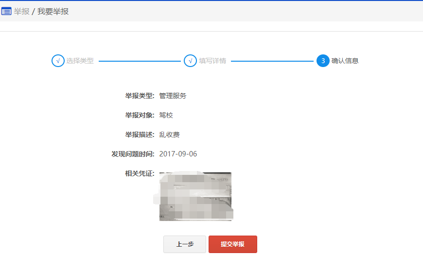 在该步骤,可以看到刚刚自己选择的举报类型、发现问题的时间等举报内容,可以检查举报内容是否有漏写或者错误的,如果有,可以点击"上一步", 进入之前的操作页面进行编辑;如果没有,请点击"提交举报",完成此次举报。