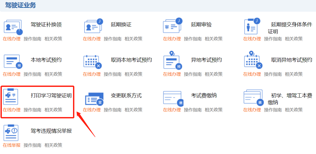 进入交管12123官方网站,在顶部菜单栏找到“业务办理”,点击并进入,在“驾驶证业务”栏中找到“打印学习驾驶证明”,点击并进入。