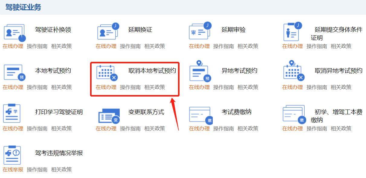 进入交管12123官方网站,在顶部菜单栏找到“业务办理”,点击并进入,在“驾驶证业务”栏中找到“取消本地考试预约”,点击并进入。