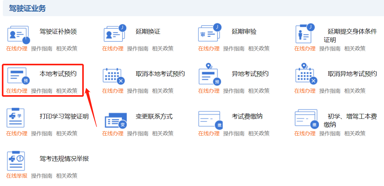 进入交管12123官方网站,在顶部菜单栏找到“业务办理”,点击并进入,在“驾驶证业务”栏中找到“本地考试预约”,点击并进入。