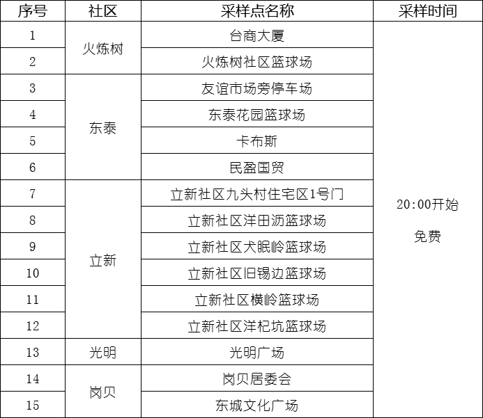 2.上述社区开展核酸期间,东城街道15分钟核酸采样点正常开放,重点区域、重点人群、重点行业、重点场所、重点单位等“五个重点”,以及未参加8月15日核酸检测的市民,可到以下采样点进行免费核酸检测: