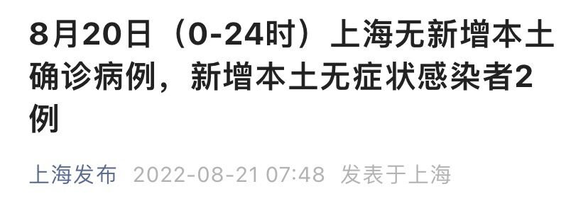 上海市卫健委8月21日通报:2022年8月20日0—24时,无新增本土确诊病例,新增本土无症状感染者2例,均在隔离管控中发现。