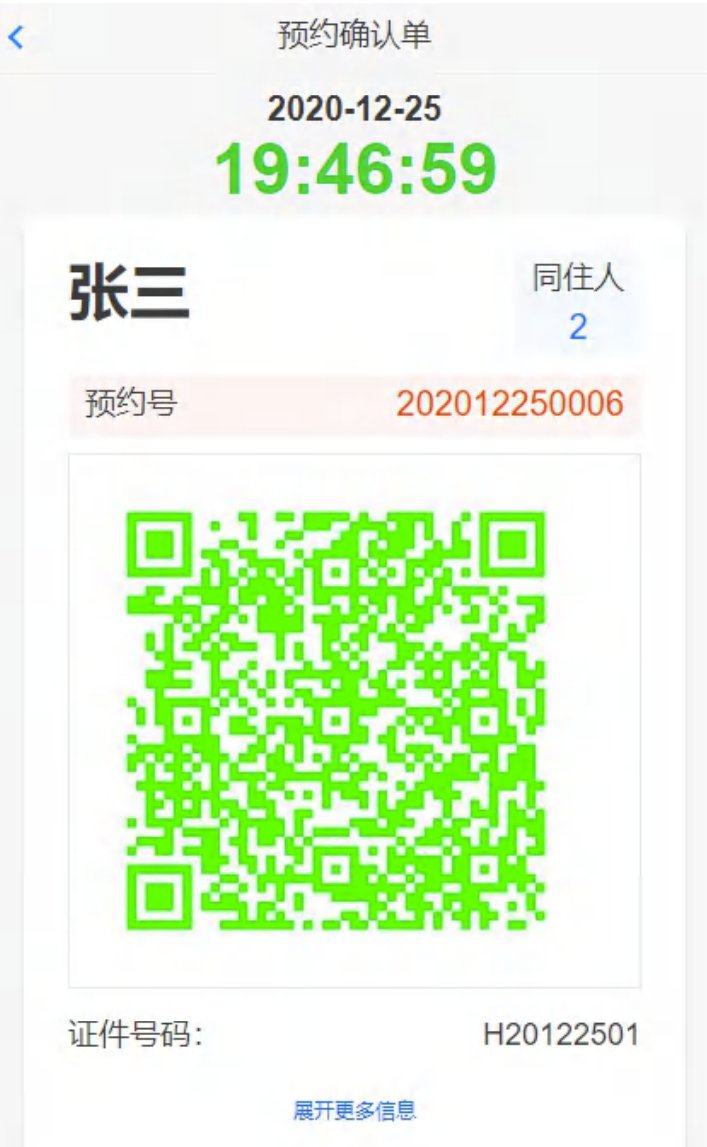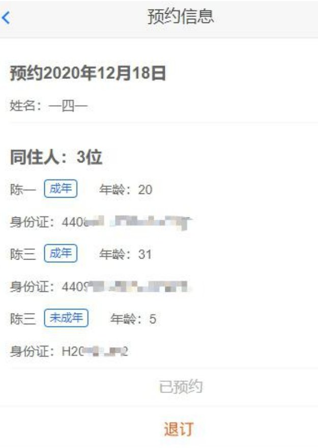 预约成功后,用户可在预约通关日期当天点击“个人中心>预约确认单”查看确认单详情。内容包括姓名、证件号码、预约时间、同住人数、同住人信息和目的地。