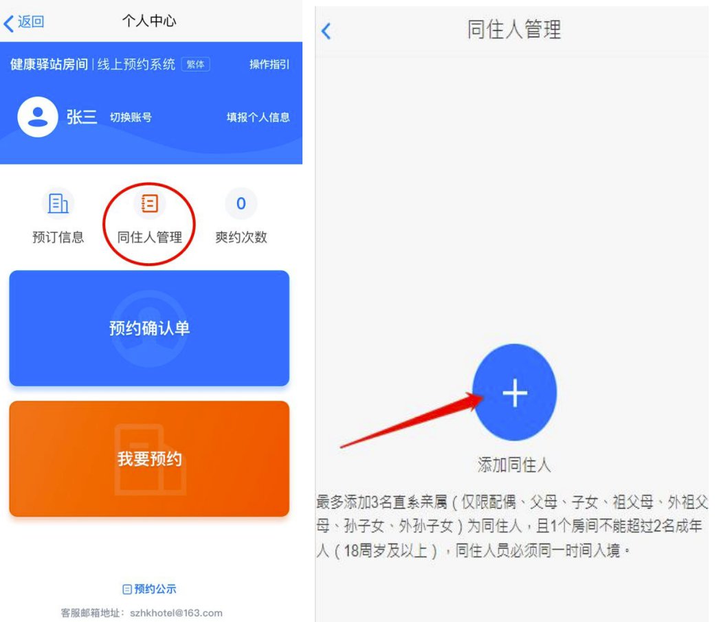 按照深圳市健康驿站人文关怀政策措施,入境人员如属于14岁以下未成年人、年满70周岁的年长者、孕产妇、患有基础性疾病人员以及其他需予以人文关怀的人员,可安排与同行直系亲属入住同一驿站房间,以便就近照顾。系统用户如果计划入境后为同行直系亲属申请人文关怀措施,入住同一驿站房间,可使用本预约系统“同行人管理”功能。但须在进行预约房间名额之前添加同住人信息。