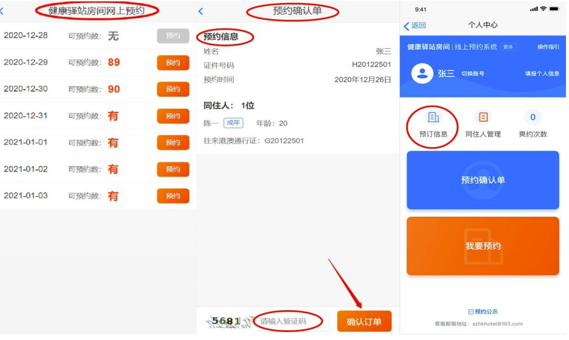 2. 在确认订单页面,确认姓名、证件号码、预约时间等预约信息无误后,输入验证码确认订单,完成预约操作。
