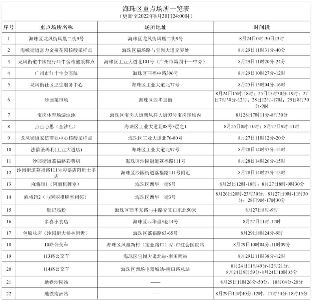 因疫情防控需要,请在相关时段到过以上重点场所的人员,立即主动向所在社区(村)报备,开展“3天2检”自我健康监测,并配合做好疫情防控措施。重点场所名单见下表,后续将按实际情况更新。