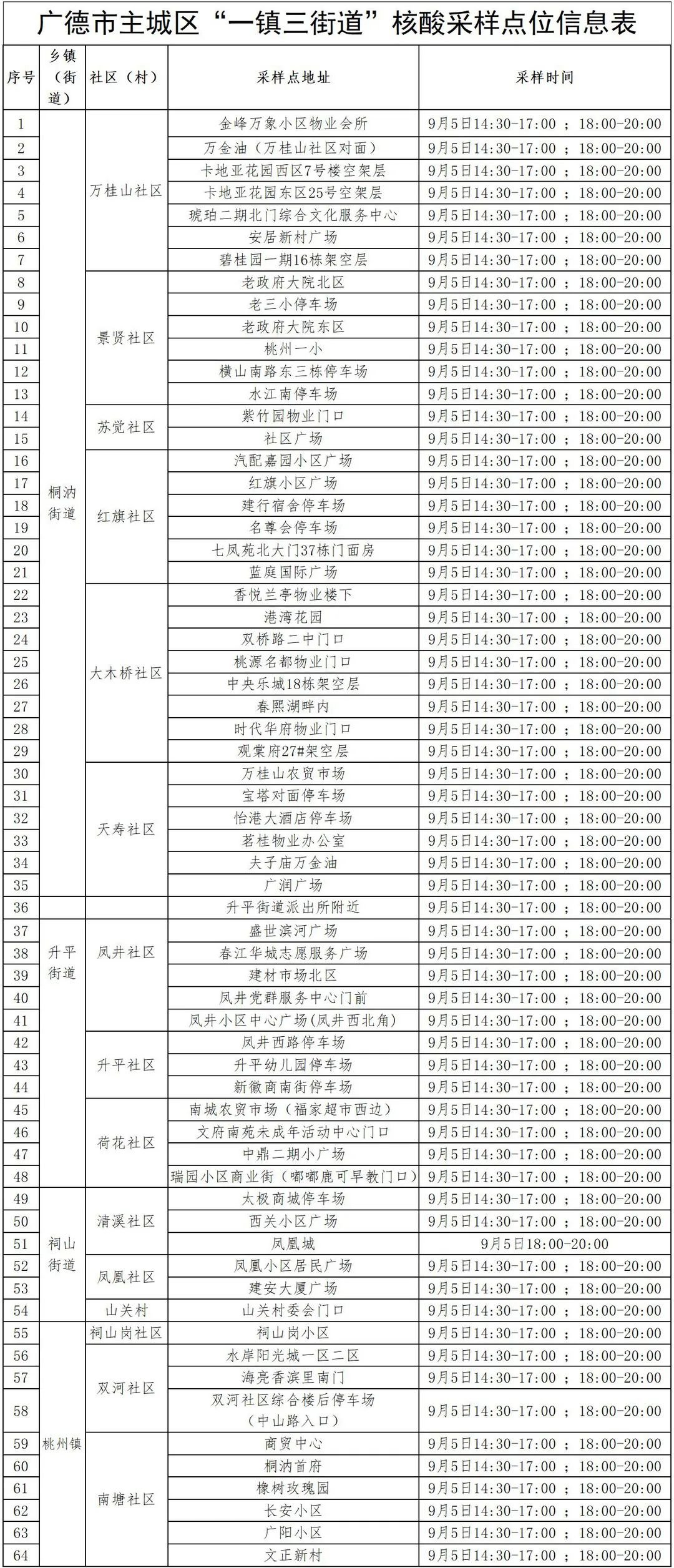9月5日下午在主城区区域(桃州镇、桐汭街道、祠山街道、升平街道)和誓节镇范围,9月6日在经开区、其他各乡镇范围和“一镇三街道”的非主城区范围开展区域核酸检测工作。其中主城区范围核酸采样点地址及时间安排见附表,其他各乡镇和经开区采样点设置自行安排。
