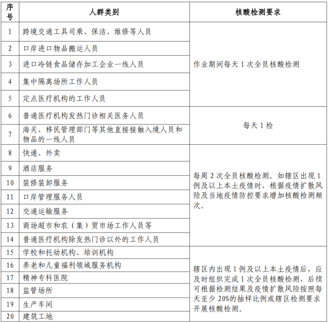 风险职业人员和重点机构场所人员核酸检测要求: