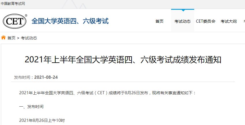 近期消息:2021年上半年全国大学英语四、六级考试(CET)成绩将于2021年8月26日发布。