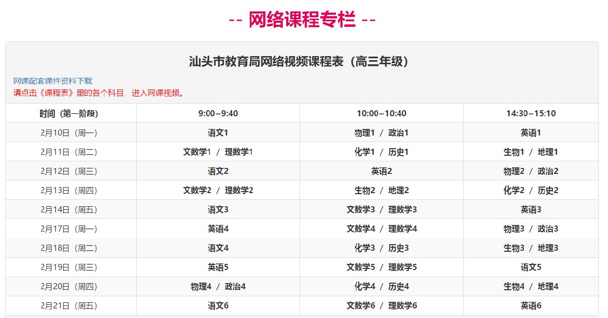 汕头市小学视频网课课程表 汕头小学上课时间表