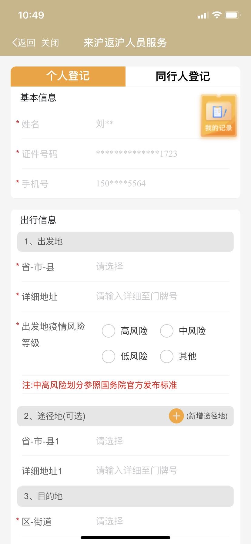 3、进行个人信息登记,依次填写出行信息【出发地、途经地、目的地】、紧急联络信息。