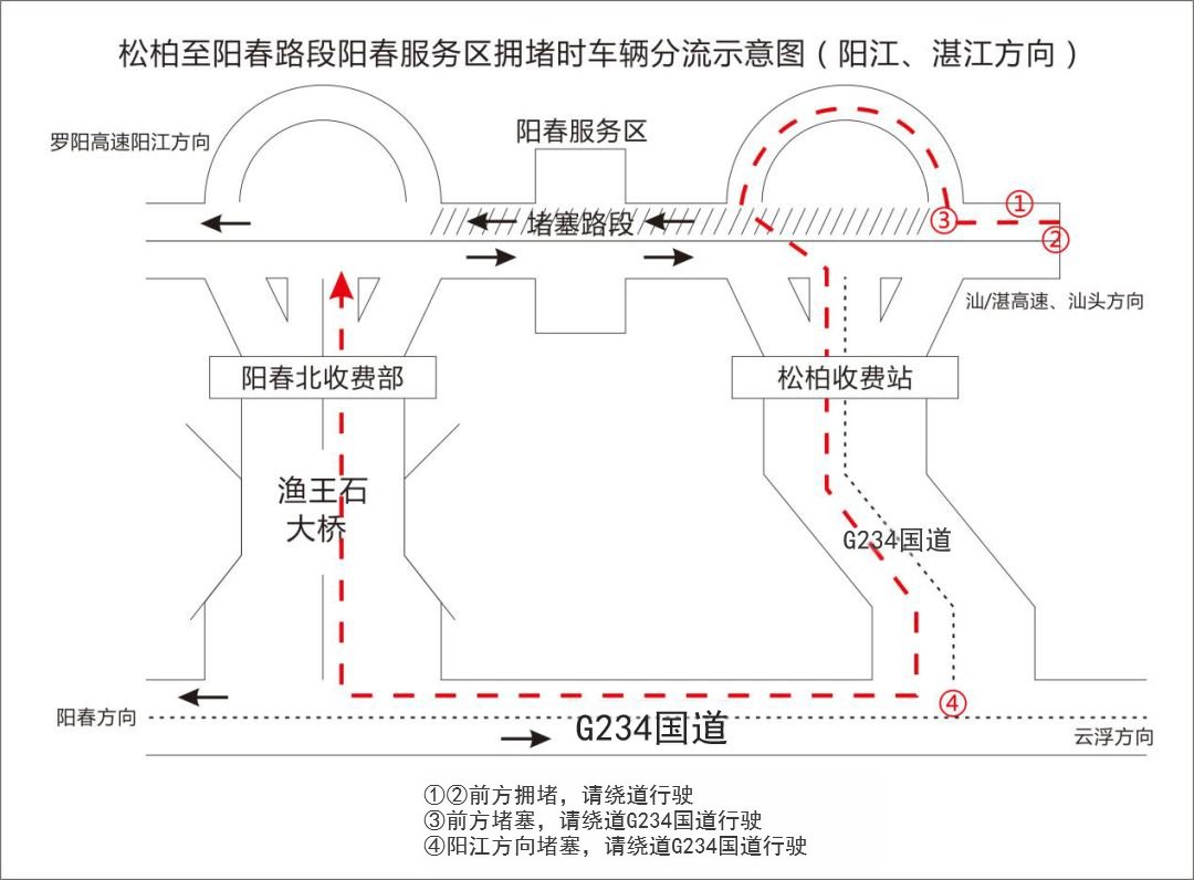 云浮往阳江、湛江方向绕行路线:肇阳高速新庆立交互通→汕湛新阳高速公路松柏收费站→G234线→鱼王石大桥→肇阳高速公路阳春北收费站→阳江、湛江方向。