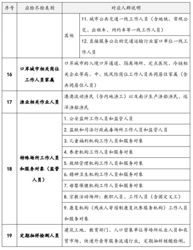 “应检尽检”(凭相关证明免费)有20个类别可免费核酸检测。