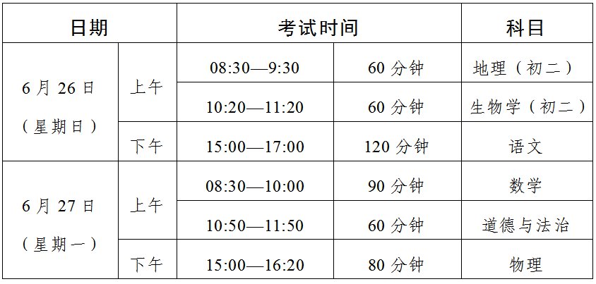 二、体育与健康、音乐、美术、信息技术等科目及物理、化学、生物实验操作等初中学业水平考试的具体时间,由各地市根据本地实际情况确定。
