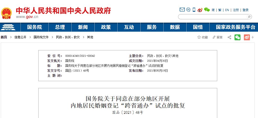 国务院同意在辽宁省、山东省、广东省、重庆市、四川省实施结婚登记和离婚登记“跨省通办”试点,在江苏省、河南省、湖北省武汉市、陕西省西安市实施结婚登记“跨省通办”试点。