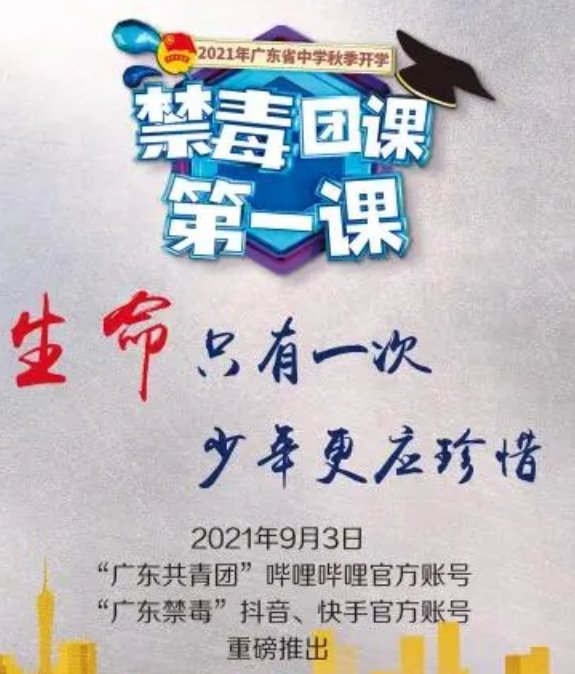 2021年广东省中学秋季开学禁毒团课第一课将于9月3日(周五)15:00-15:30播出。