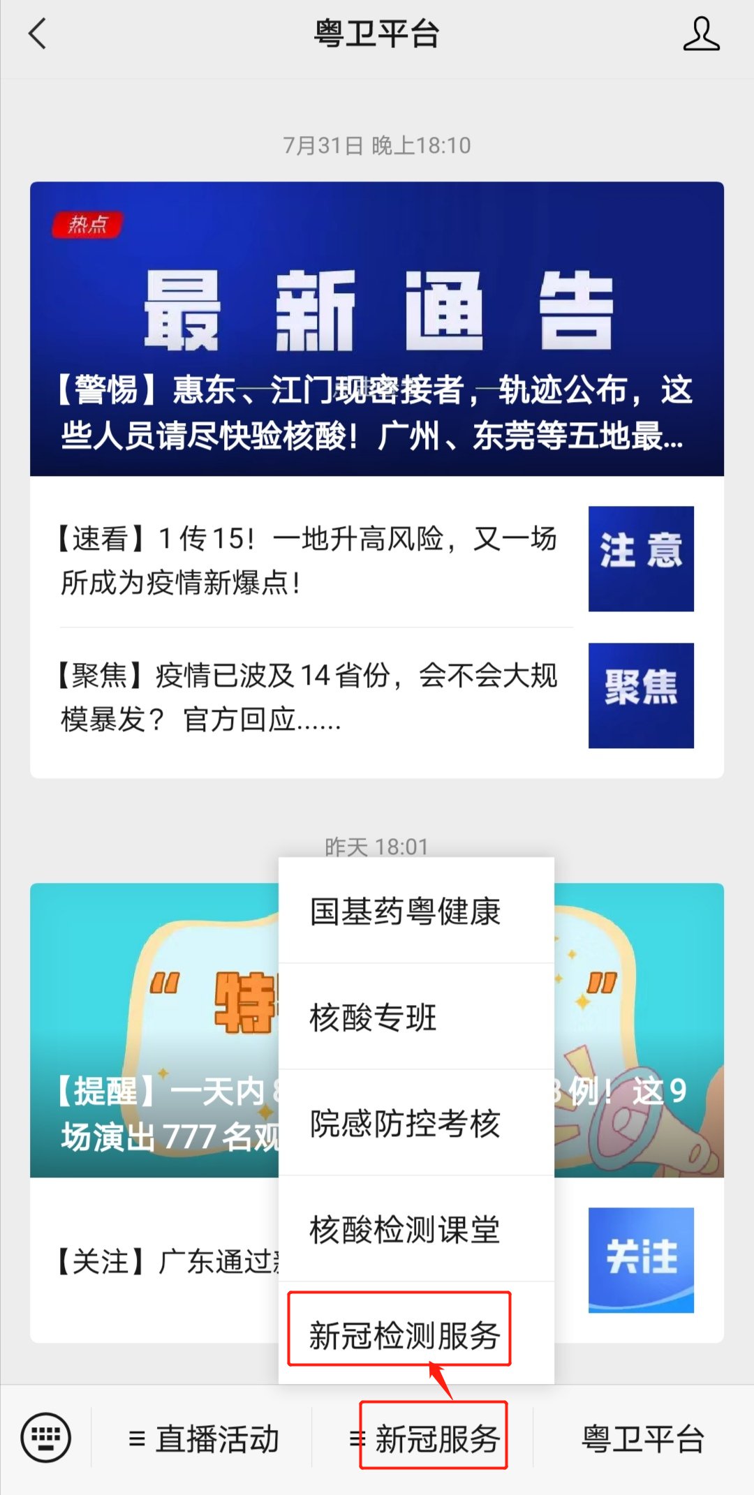 第二步:点击菜单栏【新冠服务】--【新冠检测服务】进入广东省新冠检测服务平台;