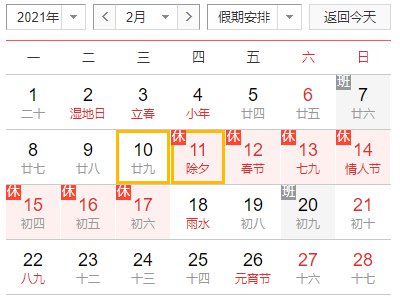 国务院办公厅于2020年11月25日发布《国务院办公厅关于2021年部分节假日安排的通知》。2021年2月11日至17日放假调休,共7天。2月7日(星期日)、2月20日(星期六)上班。