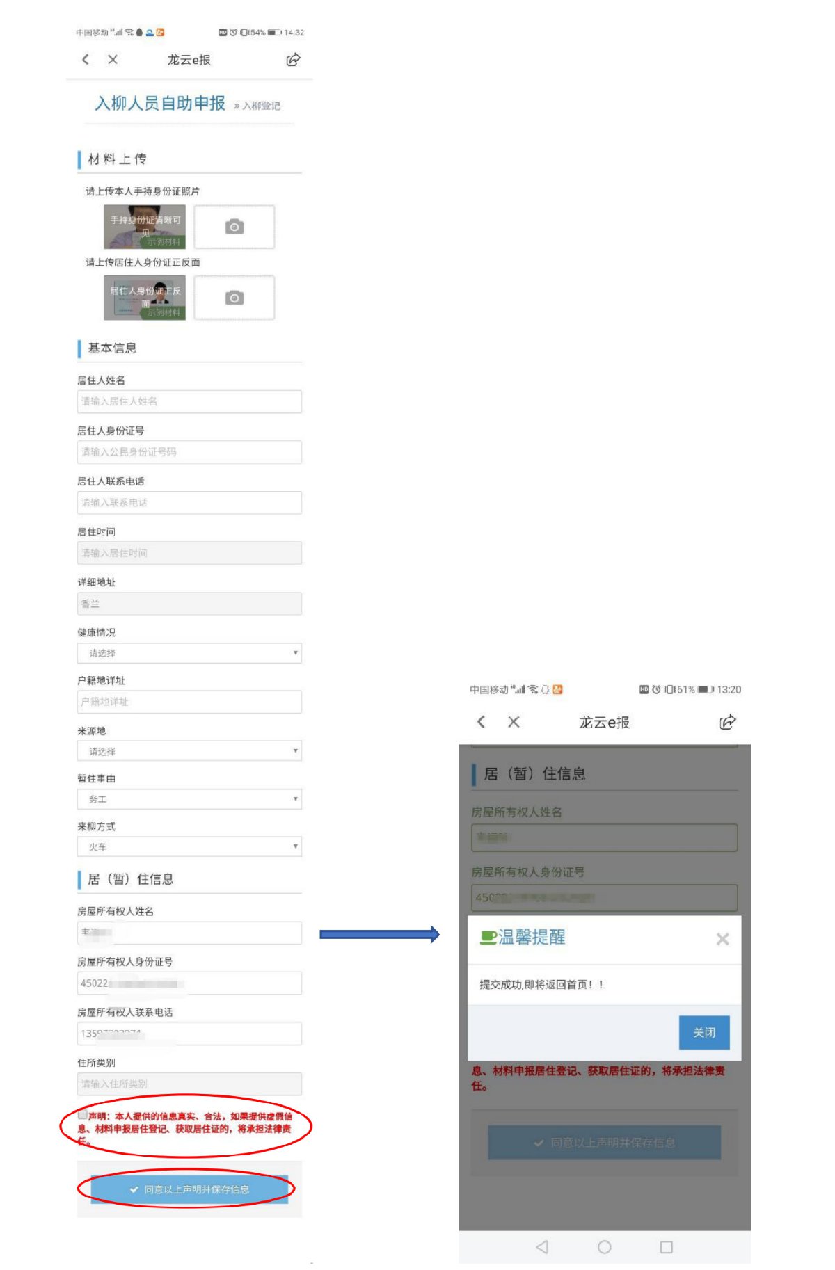 相关信息填写完成后点击“提交,继续申报”按钮跳转至人员信息的填报,填写完成后勾选声明,点击“同意以上声明并保存信息”按钮提交,跳出申报成功提示框,申报完成。