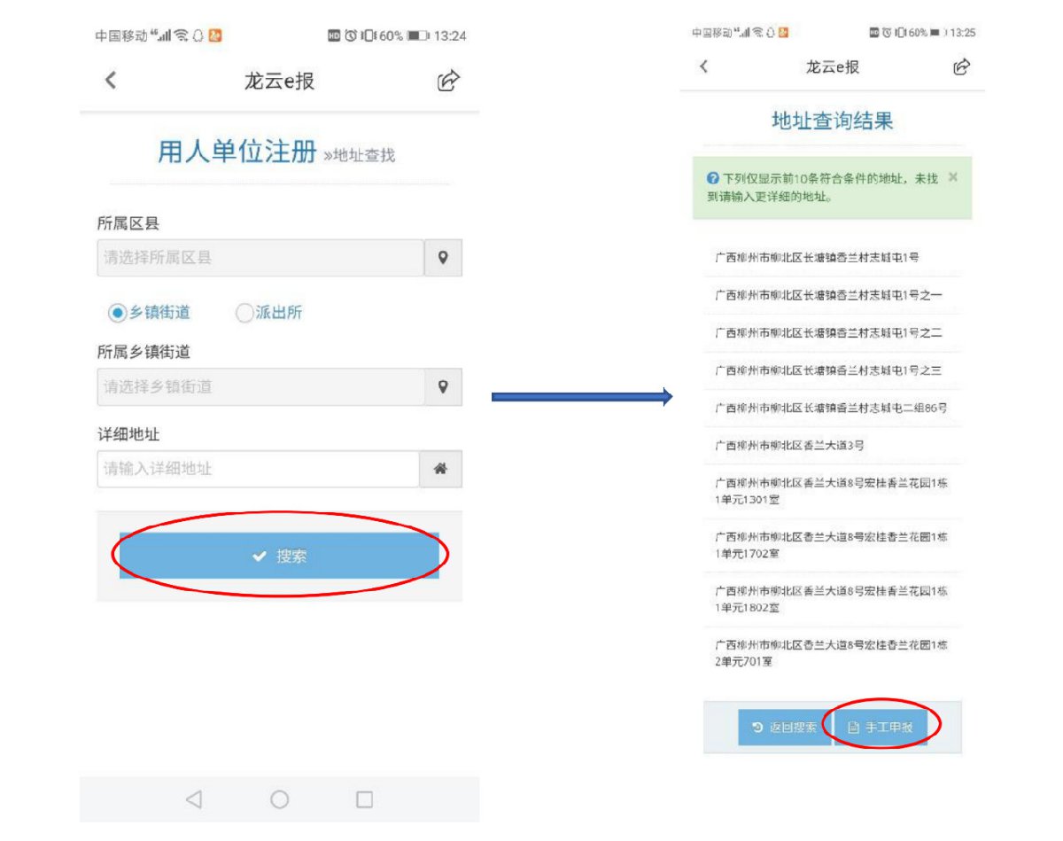 详细地址的填写可以通过点击搜索进行引用地址库现有地址,申报人也可以通过点击手工申报进入手动填写页面。