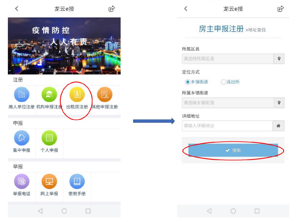 个人申报无需进行注册,点击个人申报按钮进入申报页面,对详细地址的填写可以通过点击搜索进行引用地址库现有地址。