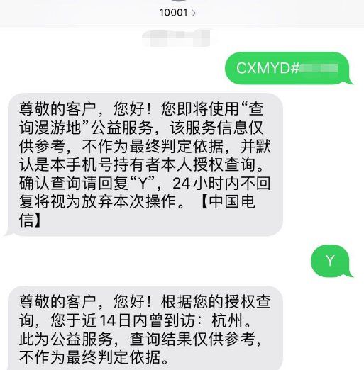 编辑短信CXMYD#身份证号码后四位到10001,授权回复Y后,实现“漫游地查询",可查询手机号近15日内的途径地信息,不提供准确位置、逗留时间等。