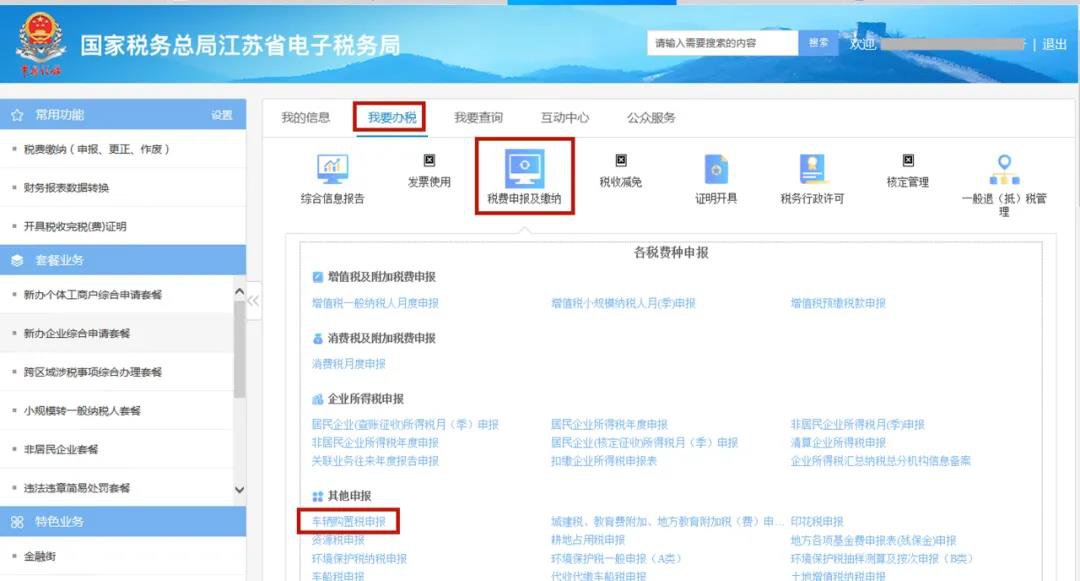 企业用户可以登录江苏省电子税务局,点击“我要办税”——“税费申报及缴纳”——“其他申报”——“车辆购置税申报”模块进行申报。