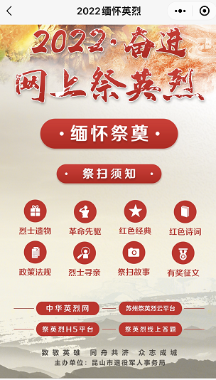 二、开展“2022 .奋进.网上祭英烈”活动。烈士家属和社会各界可通过昆山市退役军人事务局微信公众号“2022缅怀英烈”小程序向英雄寄托哀思,致敬缅怀。