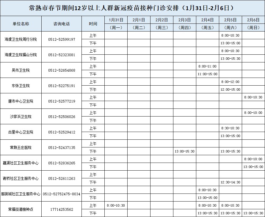 春节期间常熟新冠疫苗接种点免疫开点情况如下:
