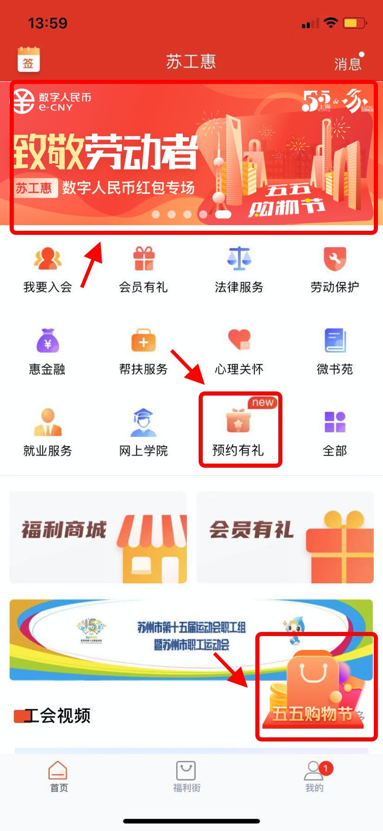 参与活动的工会会员可在手机端打开“苏工惠”App,点击首页活动banner图或“预约有礼”菜单或“五五购物节”图标(“五五购物节”图标显示需将客户端升级至1.7.0及以上版本才可见),进入“致敬劳动者-苏工惠数字人民币专场”活动页面。