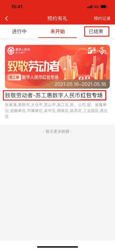 2️、报名结束后,用户进入“预约有礼”页面,点击“已结束”-“致敬劳动者-苏工惠数字人民币专场”活动,即可进入活动页面查看中签情况。