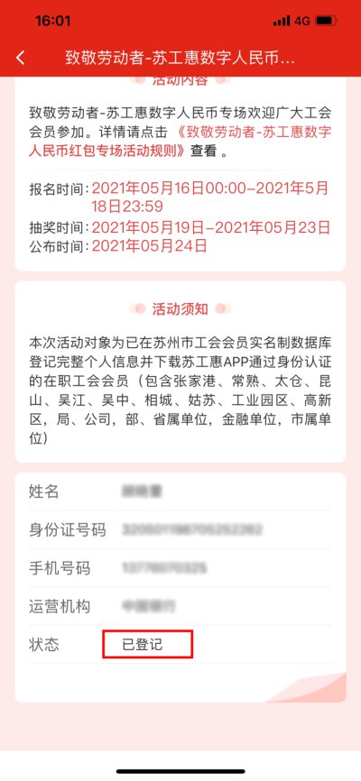 2️、已到开放查询的时间,则用户可进入“致敬劳动者-苏工惠数字人民币专场”活动页面,查看中签结果。如状态为显示为“公布中”,表示系统正在陆续公布中签结果,请稍后查询。