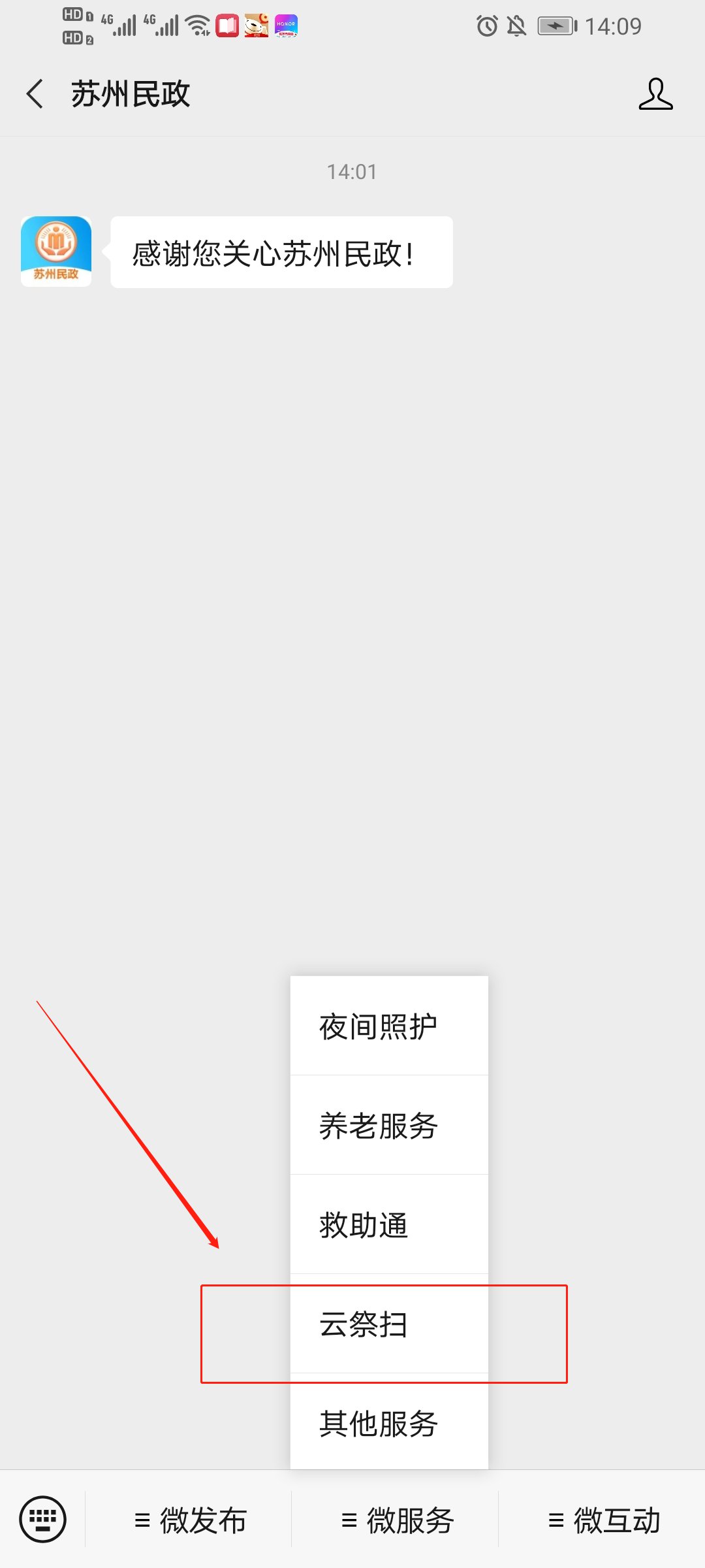 第二步:然后点击进入,在公众号下方的菜单栏中点击“微服务”-“云祭扫”(如下图所示);