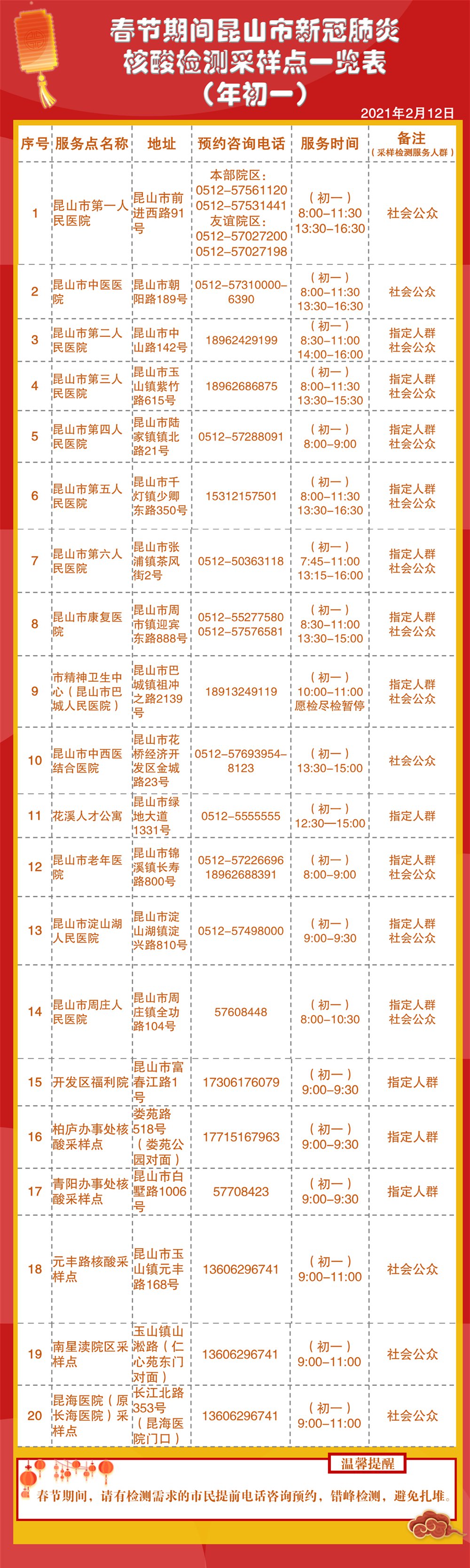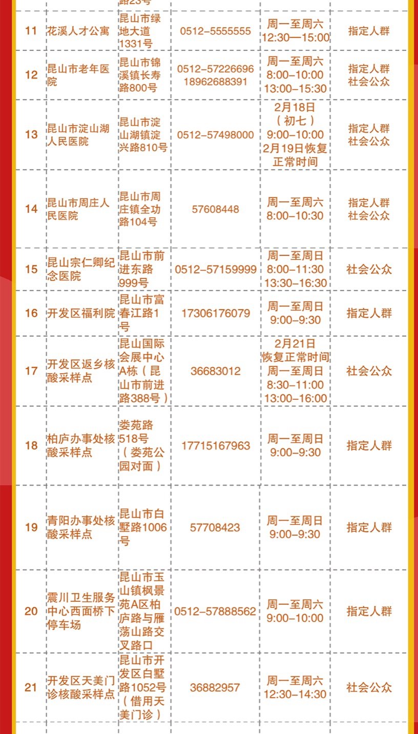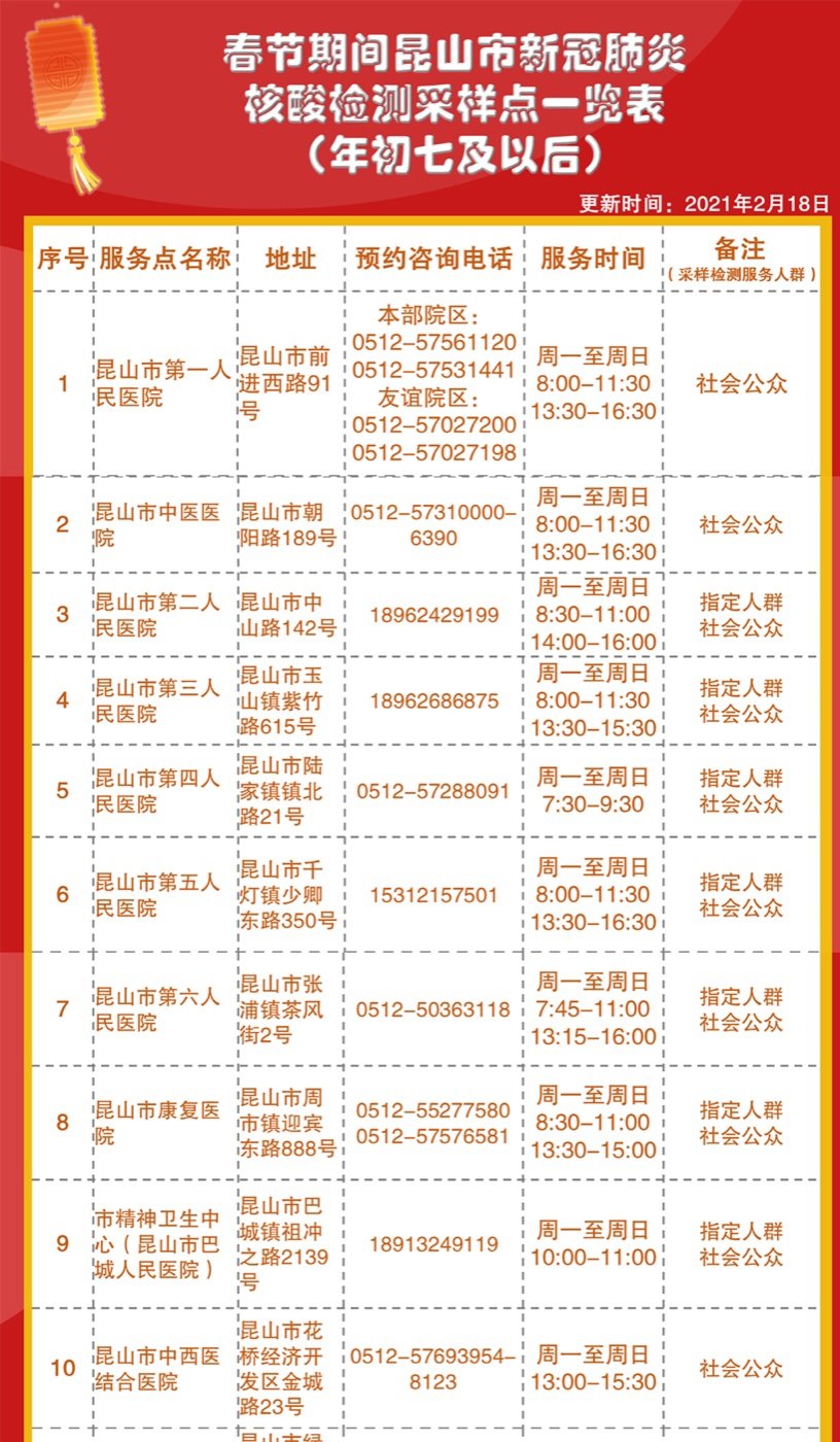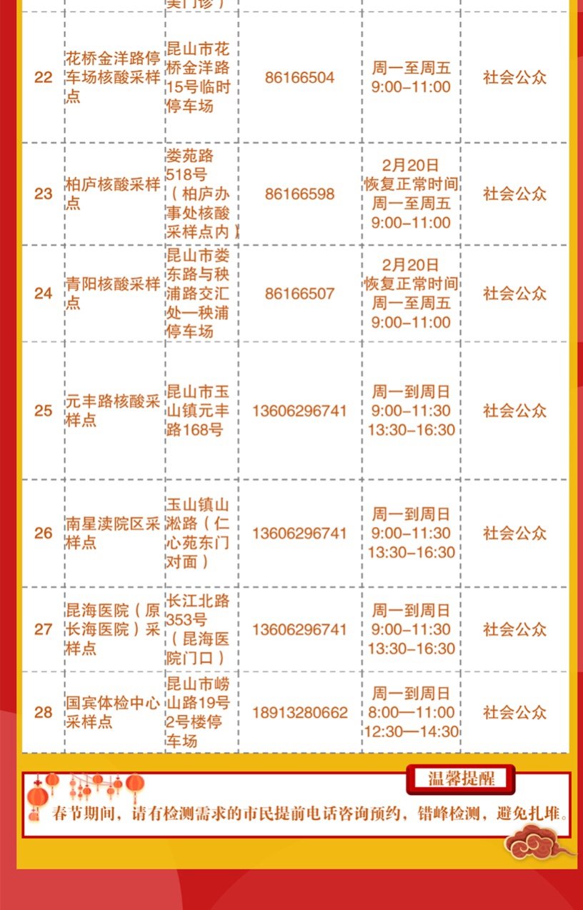 春节期间昆山市核酸检测采样点工作安排公示