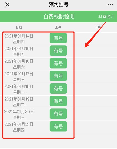 为满足返乡人员核酸检测需求,核酸检测工作调整如下:即日起我院返乡人员的核酸检测报告自采样后48小时内发放。有需求的群众可在我院微信公众号“就诊指南”中“预约挂号(普通挂号)”菜单里的“自费核酸检测”进行预约。