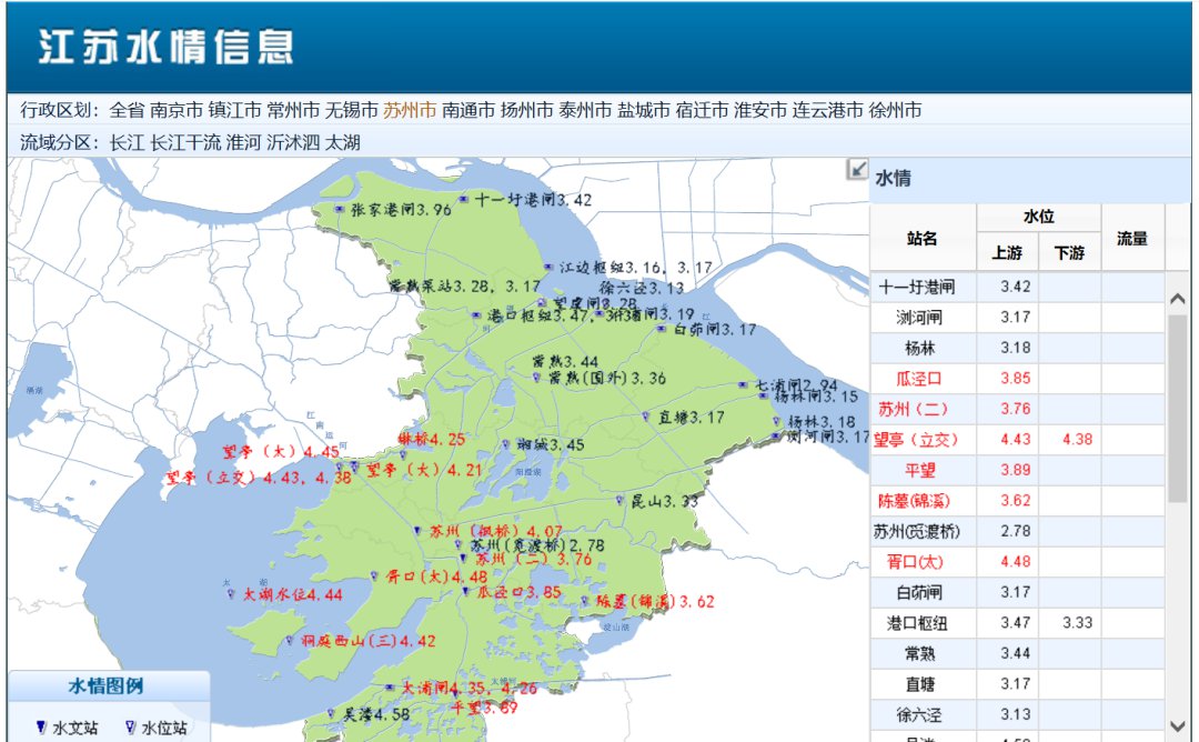 目前,苏州多个水文站超警戒水位(下图红色代表超警戒)