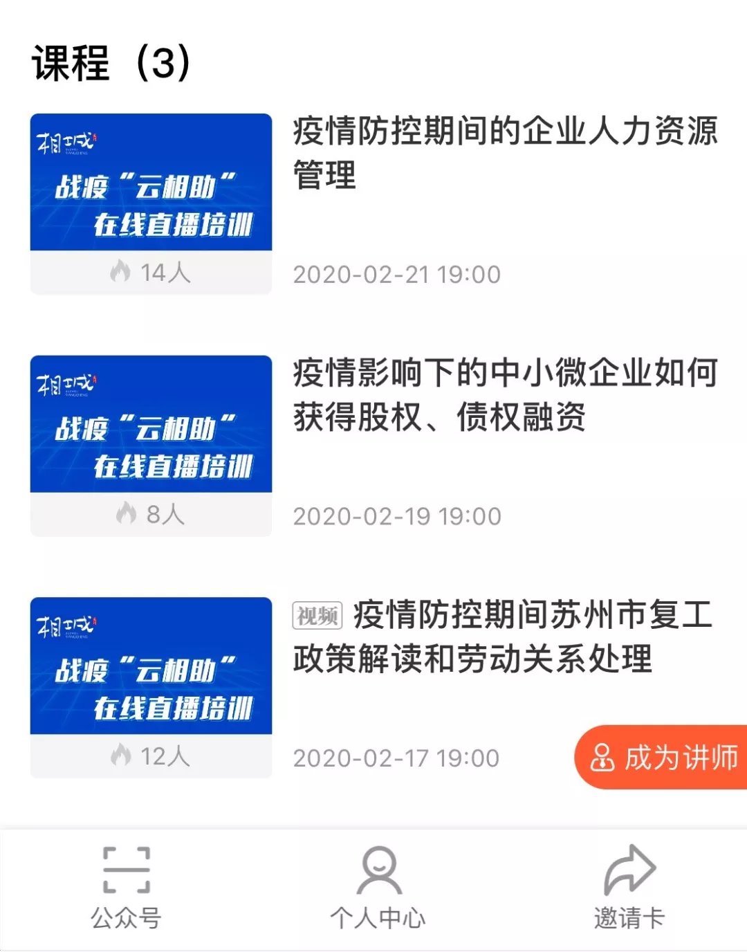 第一期培训首节课程将于2月17日晚间7:00开始,每节课程时长1小时,每周上线3场课程。更多课程通过小程序“相城政策通”以及“高层次人才一站式服务平台”中的战疫“云相助”平台进入。