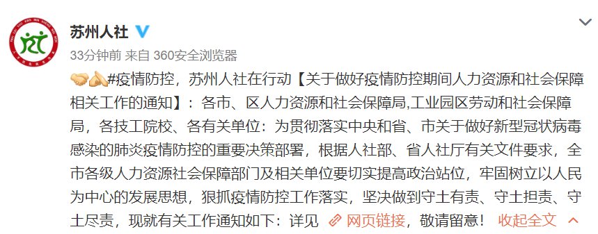 根据苏州市人力资源和社会保障局2020年1月29日15:24公布的【关于做好疫情防控期间人力资源和社会保障相关工作的通知】:
