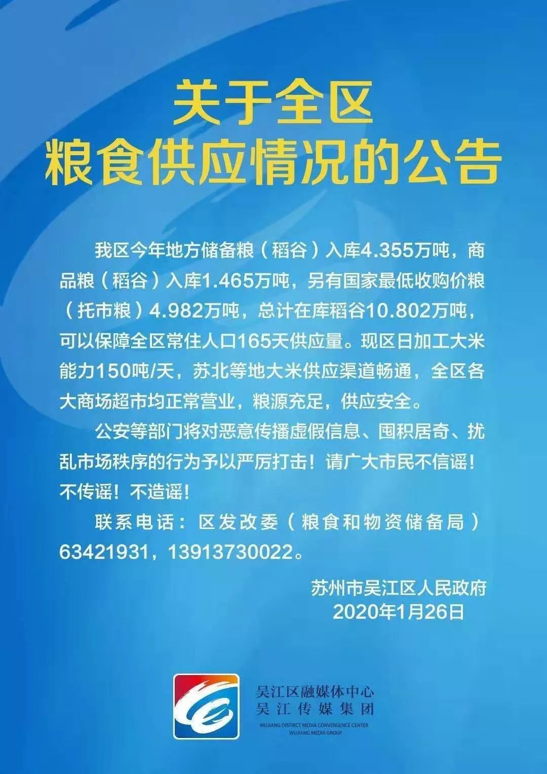 回应:大米要涨价的消息,这两天也在多地流传,不少超市或商铺都出现抢购大米的现象。今天(1月26日),苏州市吴江区人民政府发出相关辟谣公告。