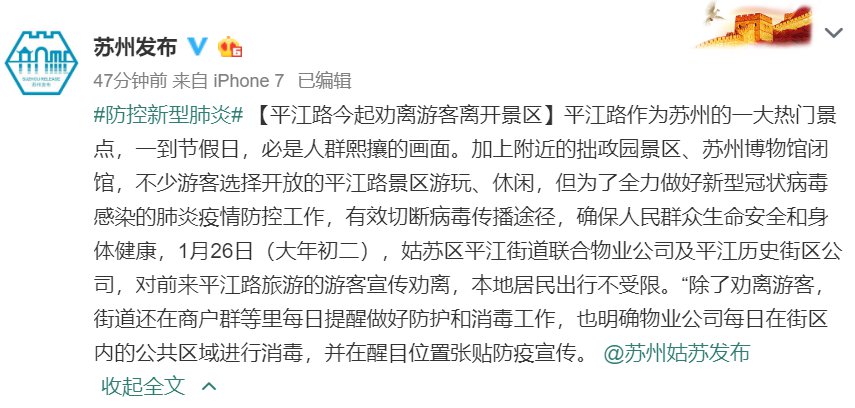 但为了全力做好新型冠状病毒感染的肺炎疫情防控工作,有效切断病毒传播途径,确保人民群众生命安全和身体健康,1月26日(大年初二),姑苏区平江街道联合物业公司及平江历史街区公司,对前来平江路旅游的游客宣传劝离,本地居民出行不受限。