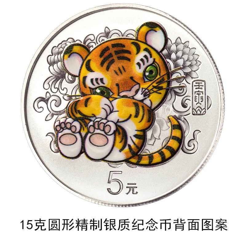 3克圆形金质纪念币和15克圆形银质纪念币(彩色)背面图案均为卡通风格小虎造型,衬以吉祥花卉等装饰。