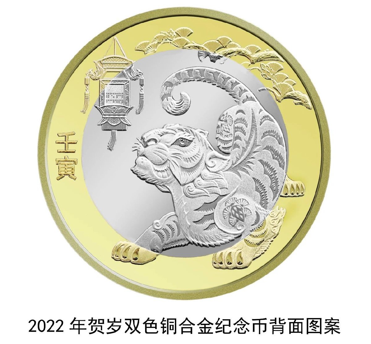 背面主景图案为中国传统剪纸艺术与装饰年画元素相结合的老虎形象,衬景图案为花灯和松枝、松果,币面左侧刊“壬寅”字样。