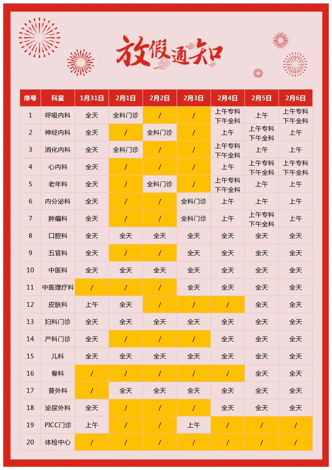 3.心电B超室:1月31日—2月6日正常开诊,特殊项目检查均正常开展。